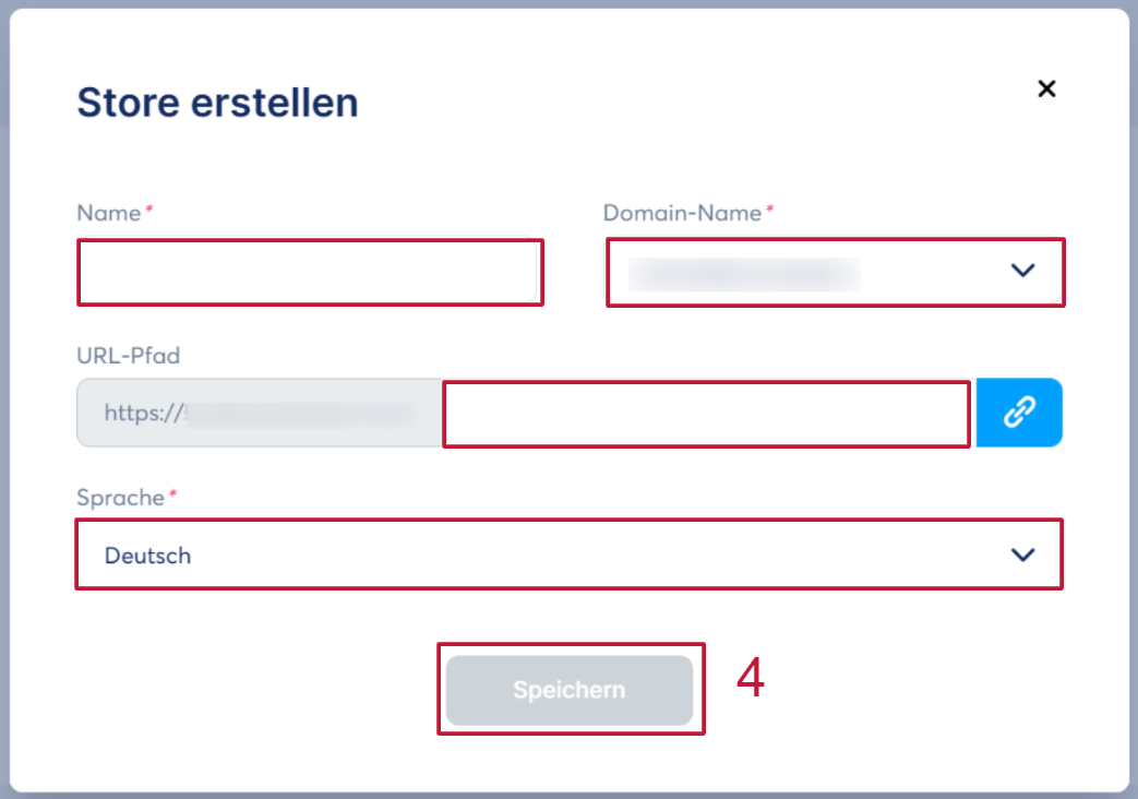 Es erscheint ein Popup-Fenster, in das Sie den Namen, die Domain, den URL-Pfad und die Sprache eingeben müssen. Klicken Sie dann auf „Speichern“, um die Erstellung des neuen digitalen Stores abzuschließen (4).