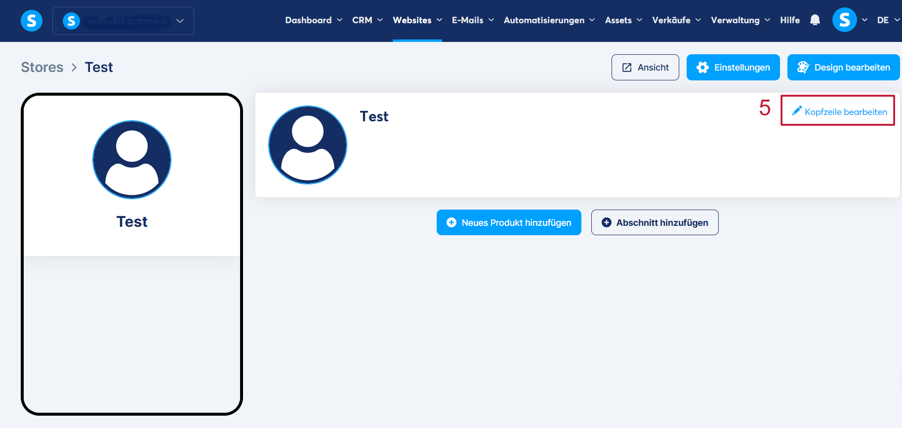 Sie können auf „Kopfzeile bearbeiten“ klicken, um die Kopfzeile Ihres Online-Stores zu ändern (5).