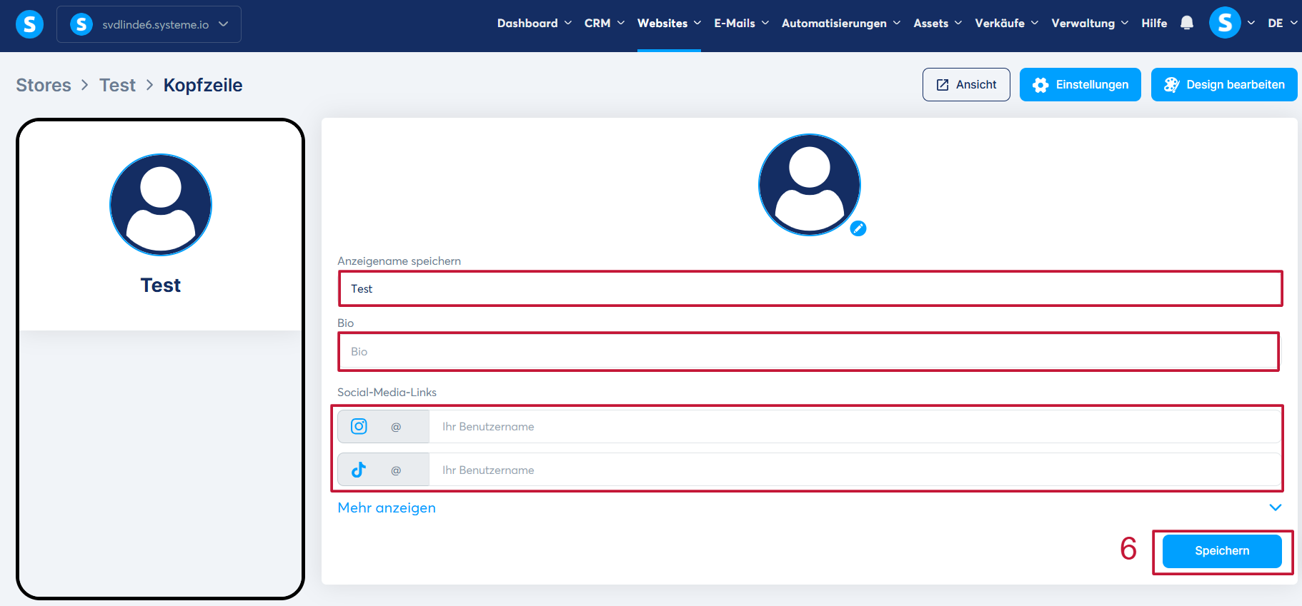 Desweiteren können auch Links zu Ihren Social-Media-Konten hinzufügen, wie Instagram und TikTok. Klicken Sie auf „Mehr anzeigen“, um alle verfügbaren Optionen zu sehen. Geben Sie anschließend Ihren Benutzernamen ein und klicken Sie auf „Speichern“ (6).