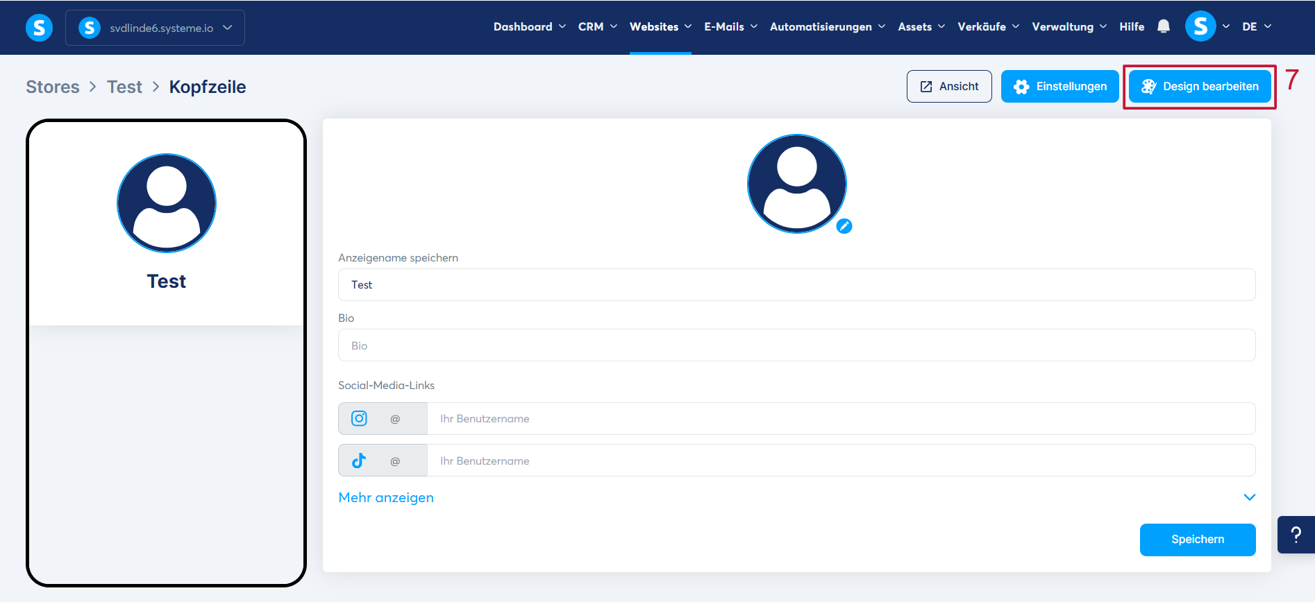 In der Kopfzeile können Sie das Store-Bild, den Namen und die Bio bearbeiten und Links zu Ihren sozialen Netzwerken hinzufügen.