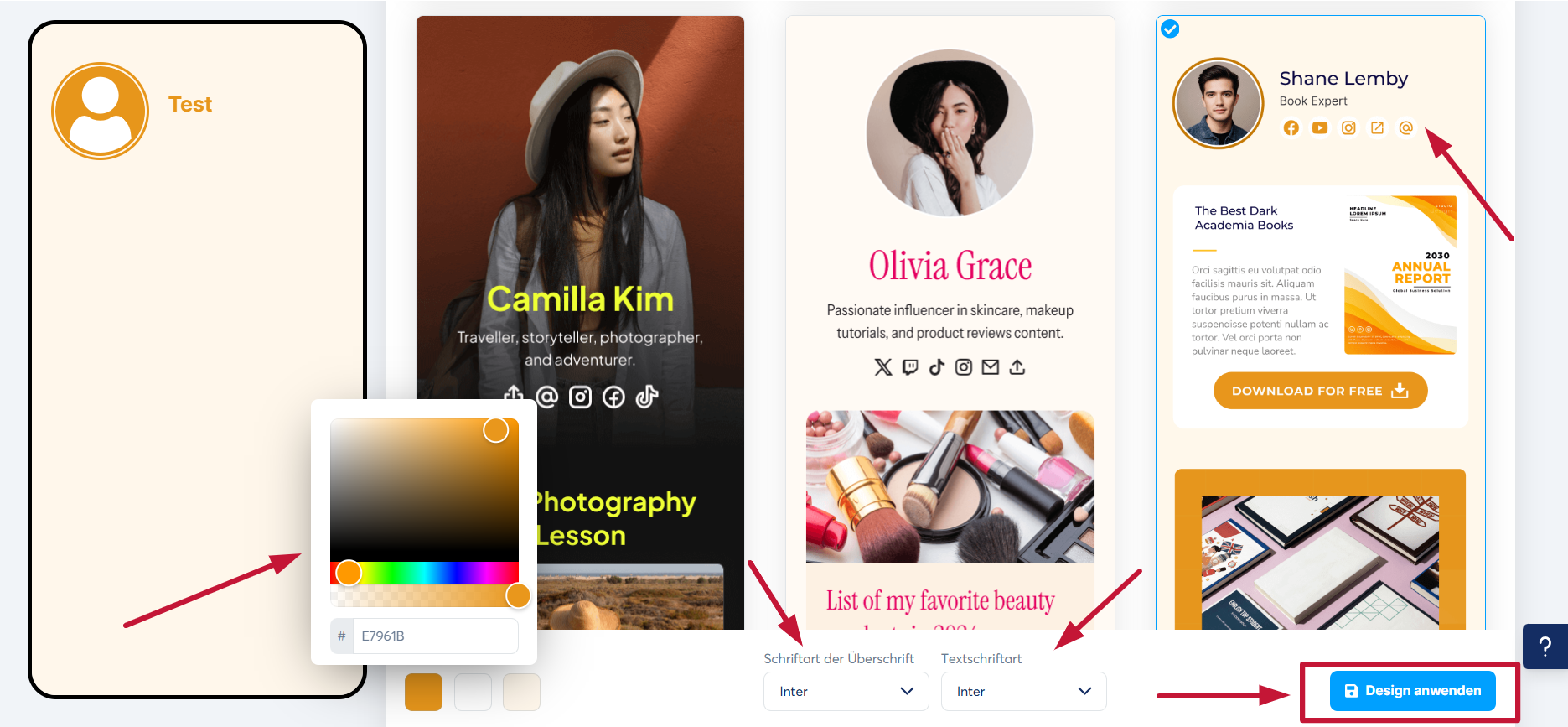 Es werden verschiedene Vorlagen angezeigt. Sie können die Vorlage auswählen, die Ihnen am besten gefällt, die Farben der Anzeige ändern und dann auf „Design anwenden“ klicken.