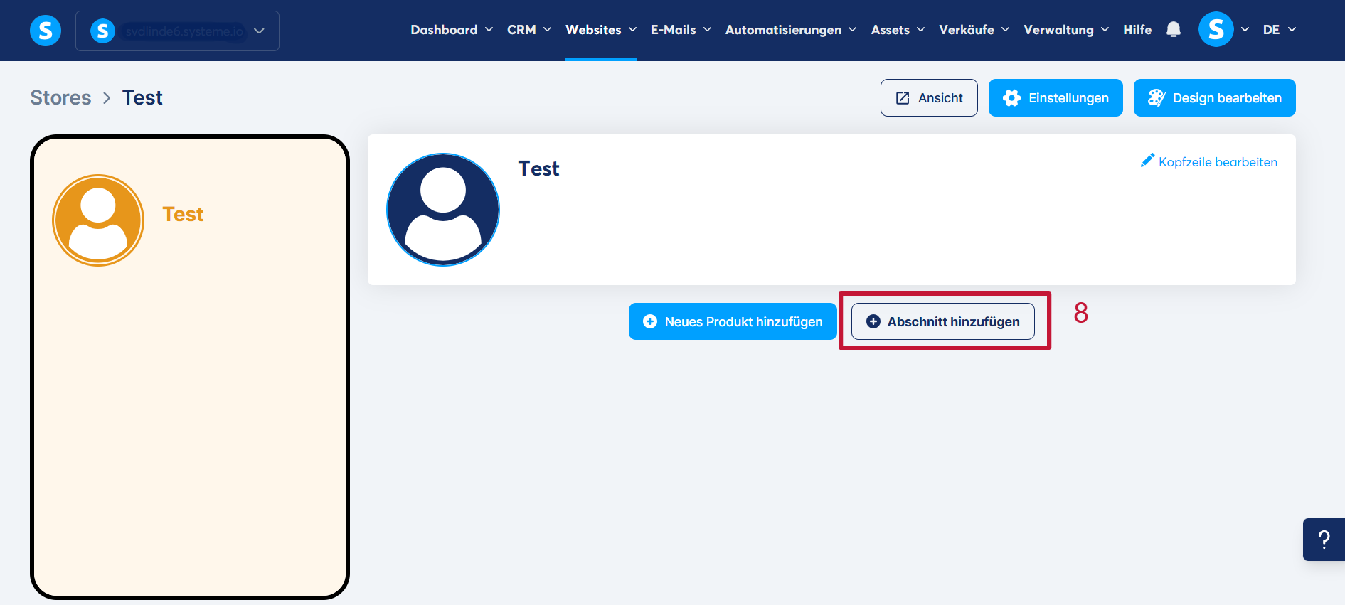 Sie können einen Bereich/ Abschnitt zu Ihrem Store hinzufügen, indem Sie auf „Abschnitt hinzufügen“ klicken (8).