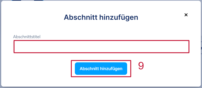 Es erscheint ein Pop-up-Fenster, in dem Sie einen Titel für Ihren Abschnitt eingeben und dann zum Speichern auf „Abschnitt hinzufügen“ klicken müssen (9).