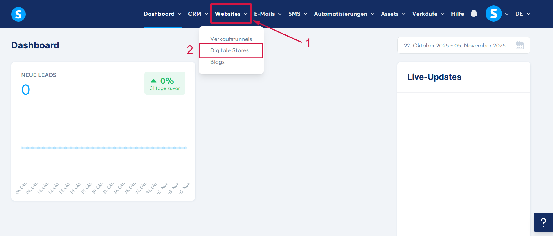 Gehen Sie auf die Schaltfläche „Websites“ (1) und klicken Sie dann auf „Digitale Stores“ (2).
