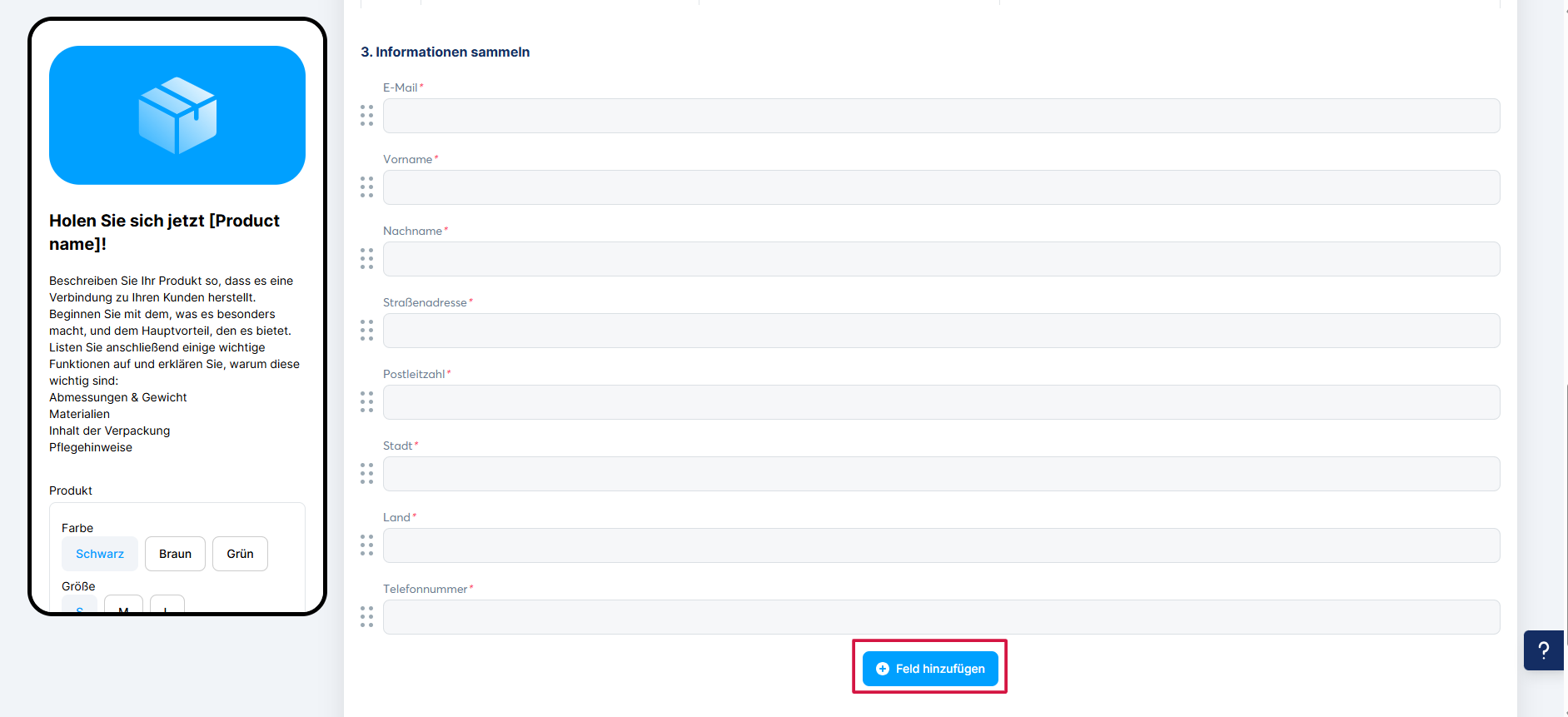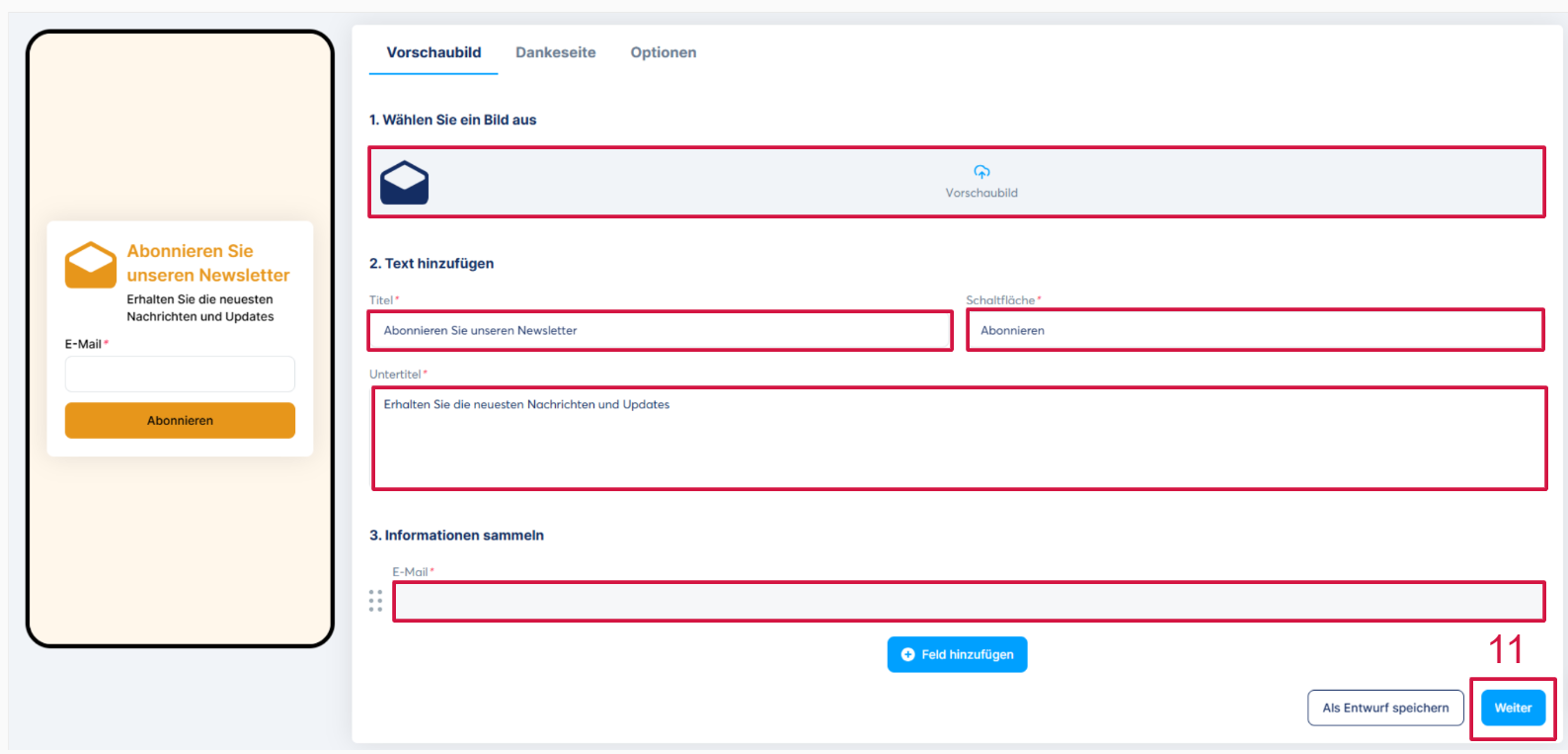 Verwenden Sie diese Option, wenn Sie E-Mail-Adressen sammeln möchten. Es müssen drei Tabs konfiguriert werden: