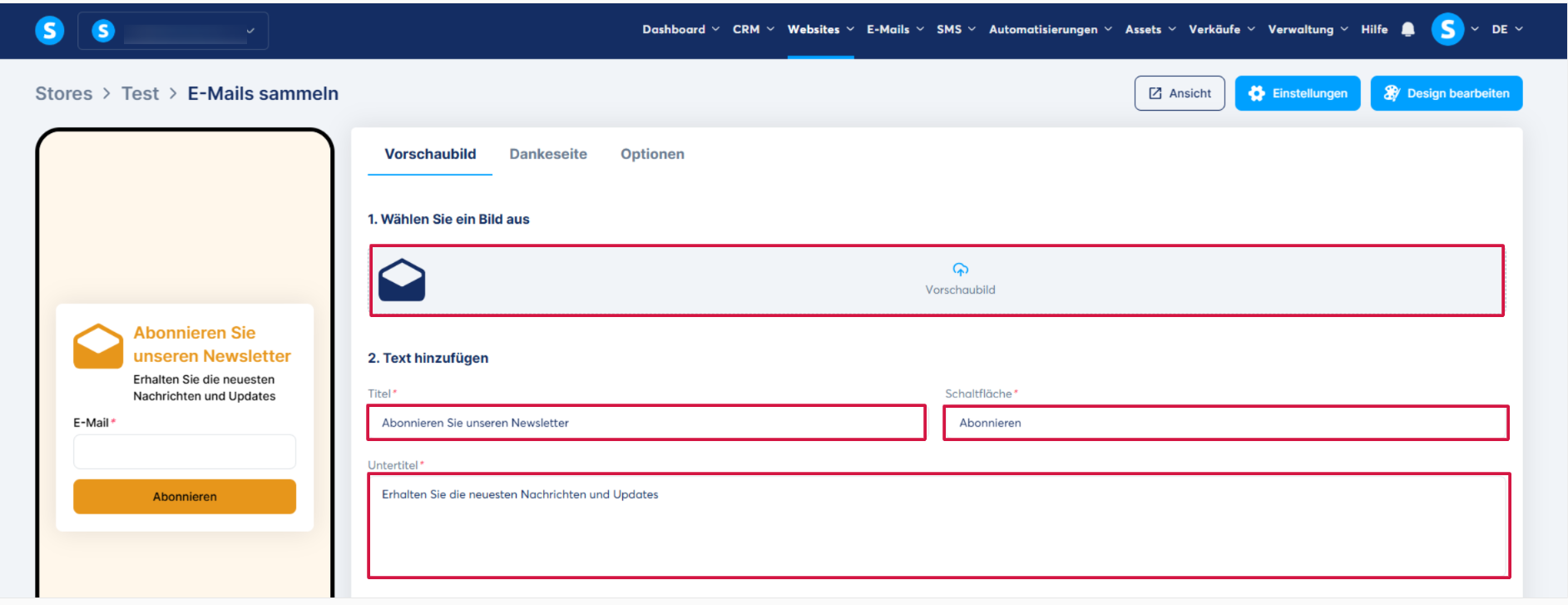 1. Vorschaubild: Hier wählen Sie das gewünschte Vorschaubild aus und können zudem den Titel, den Button und den Untertitel bearbeiten.
