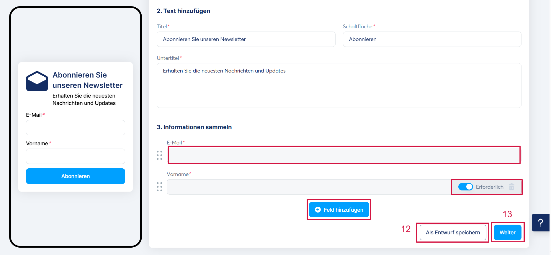Wenn alles eingerichtet ist, können Sie Ihre Änderungen speichern, indem Sie auf „Als Entwurf speichern“ (12) klicken, oder auf „Weiter“, um zu speichern und zum zweiten Tab fortzufahren (13).