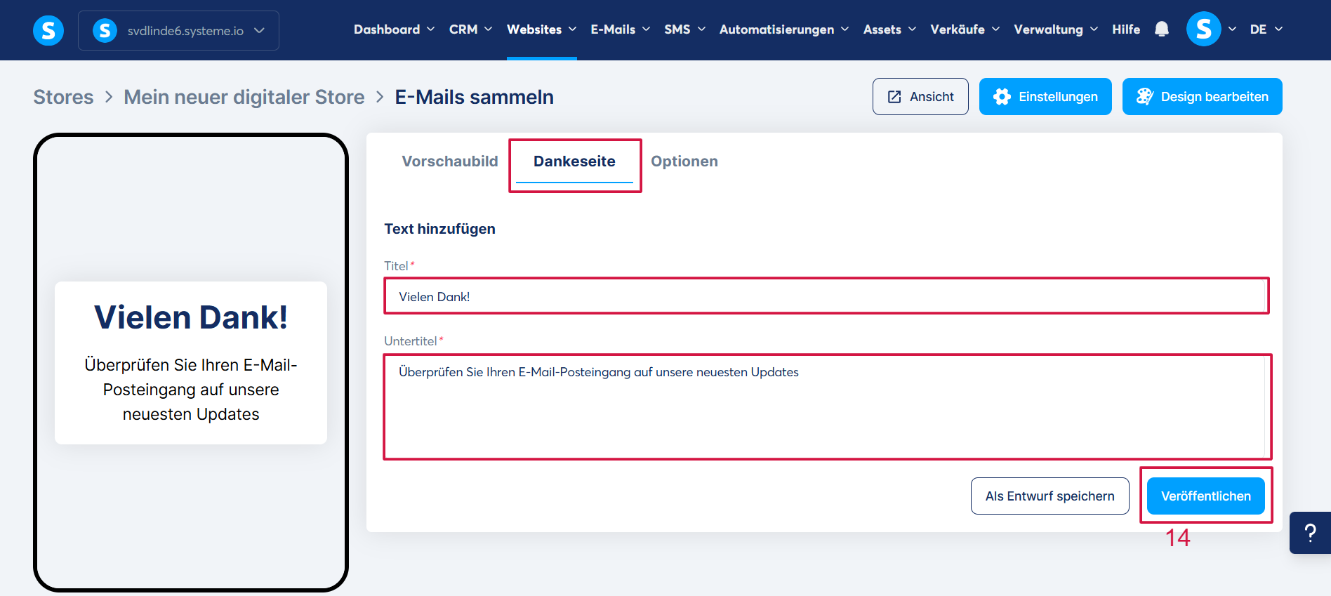 Zum Schluss müssen Sie auf „Veröffentlichen“ klicken, damit Ihr E-Mail-Sammelprodukt in Ihrem Store sichtbar wird (14).