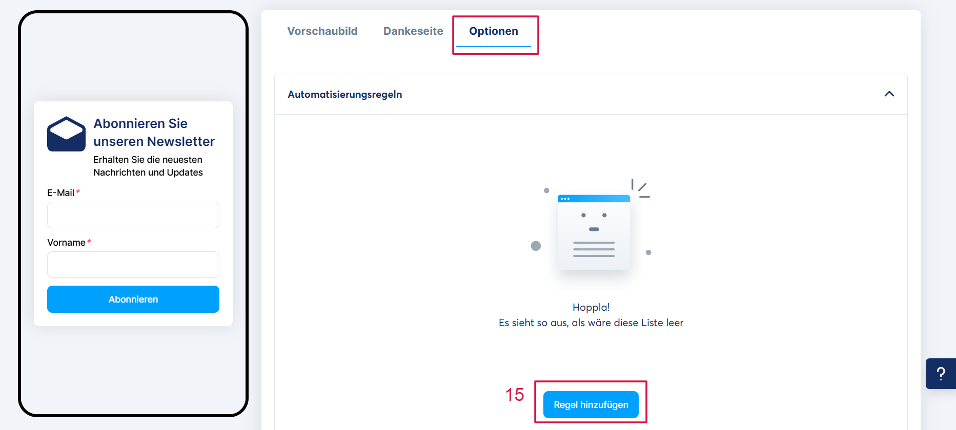 Um eine Regel hinzuzufügen, klicken Sie auf „Regel hinzufügen“ (15).