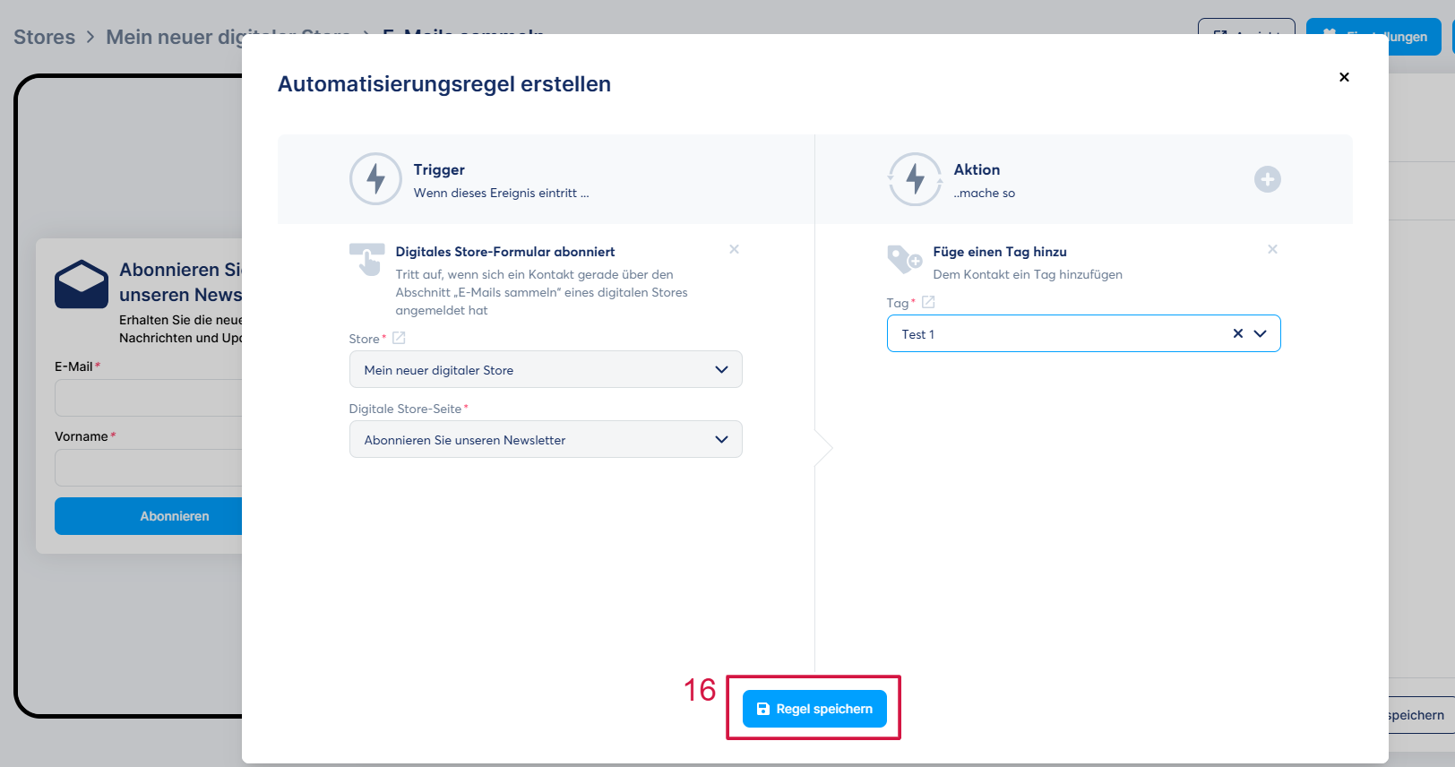 Wählen Sie im angezeigten Pop-up-Fenster „Digitales Shop-Formular abonniert“ als Auslöser aus und wählen Sie anschließend die Aktion, die nach der Anmeldung eines Leads über den Bereich E-Mails sammeln Ihres digitalen Shops ausgelöst werden soll (in diesem Beispiel haben wir „Tag hinzufügen“ ausgewählt). Klicken Sie abschließend auf „Regel speichern“ (16).