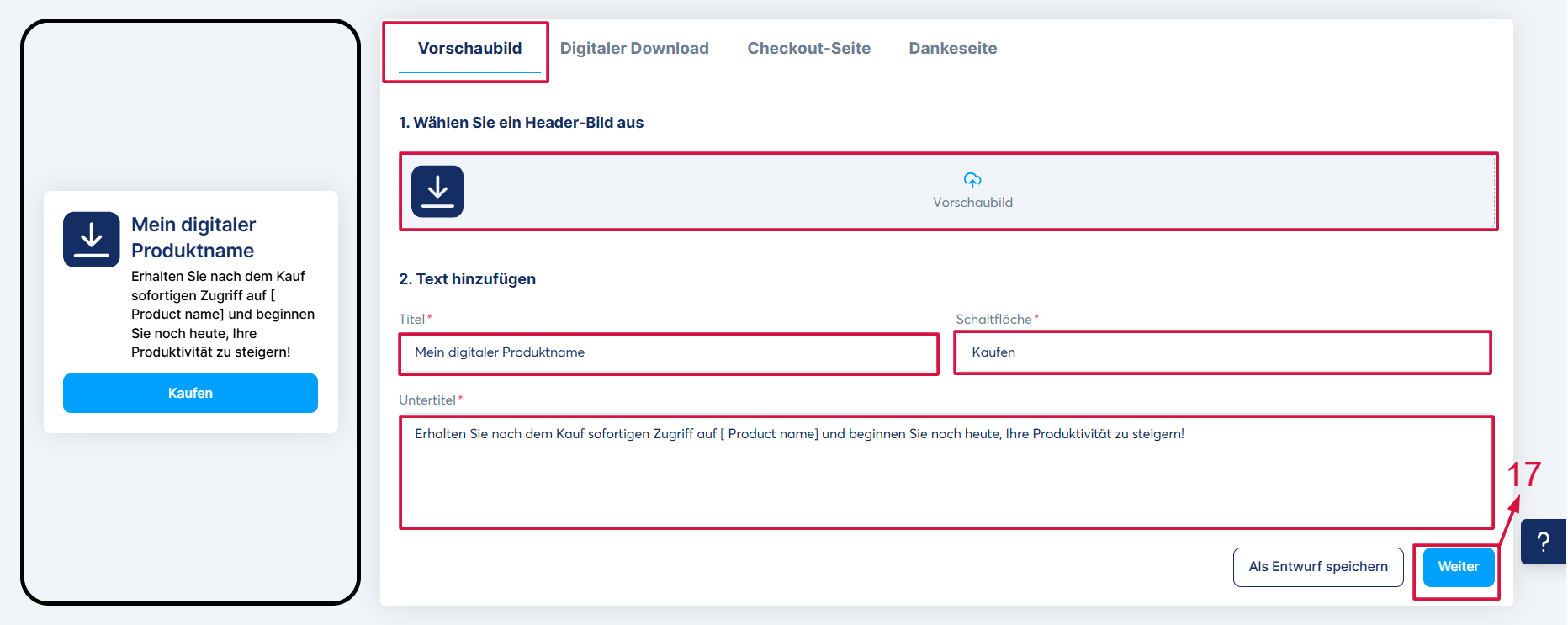 Klicken Sie anschließend auf „Weiter“ (17), um zu speichern und zum zweiten Tab zu gelangen.