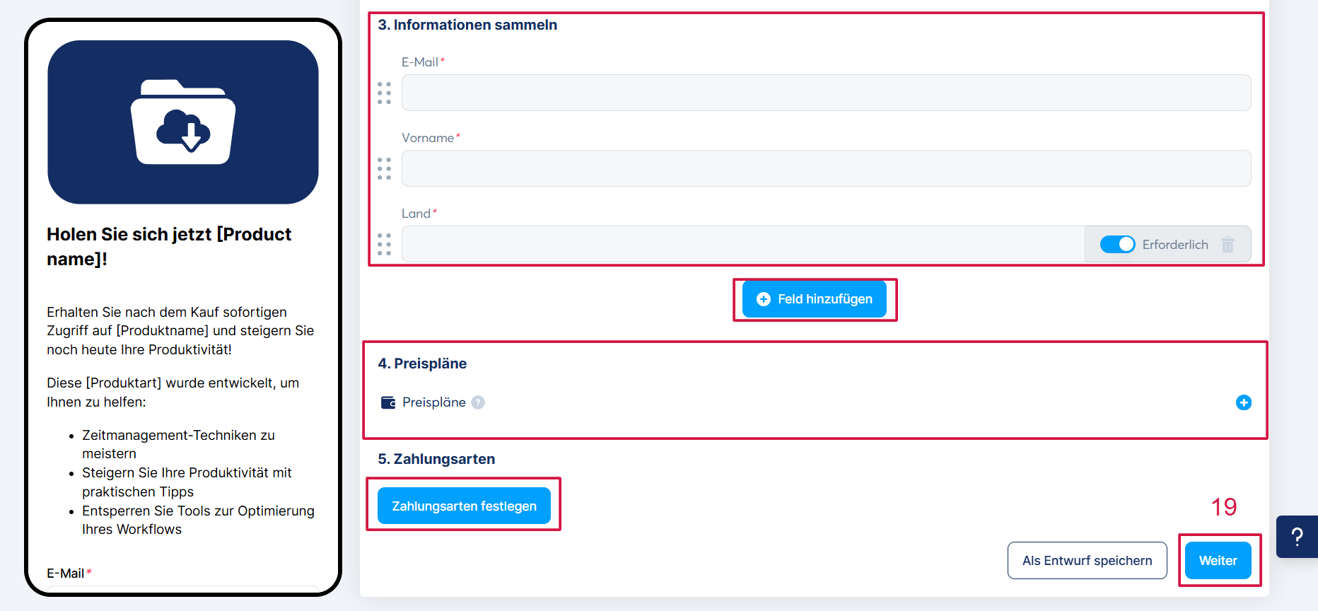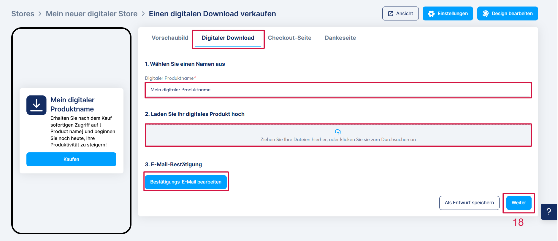 2. Digitaler Download: Geben Sie Ihrem digitalen Produkt einen Titel, laden Sie die Datei hoch und bearbeiten Sie die Bestätigungs-E-Mail, die nach der Zahlung automatisch an Ihre Kunden gesendet wird.