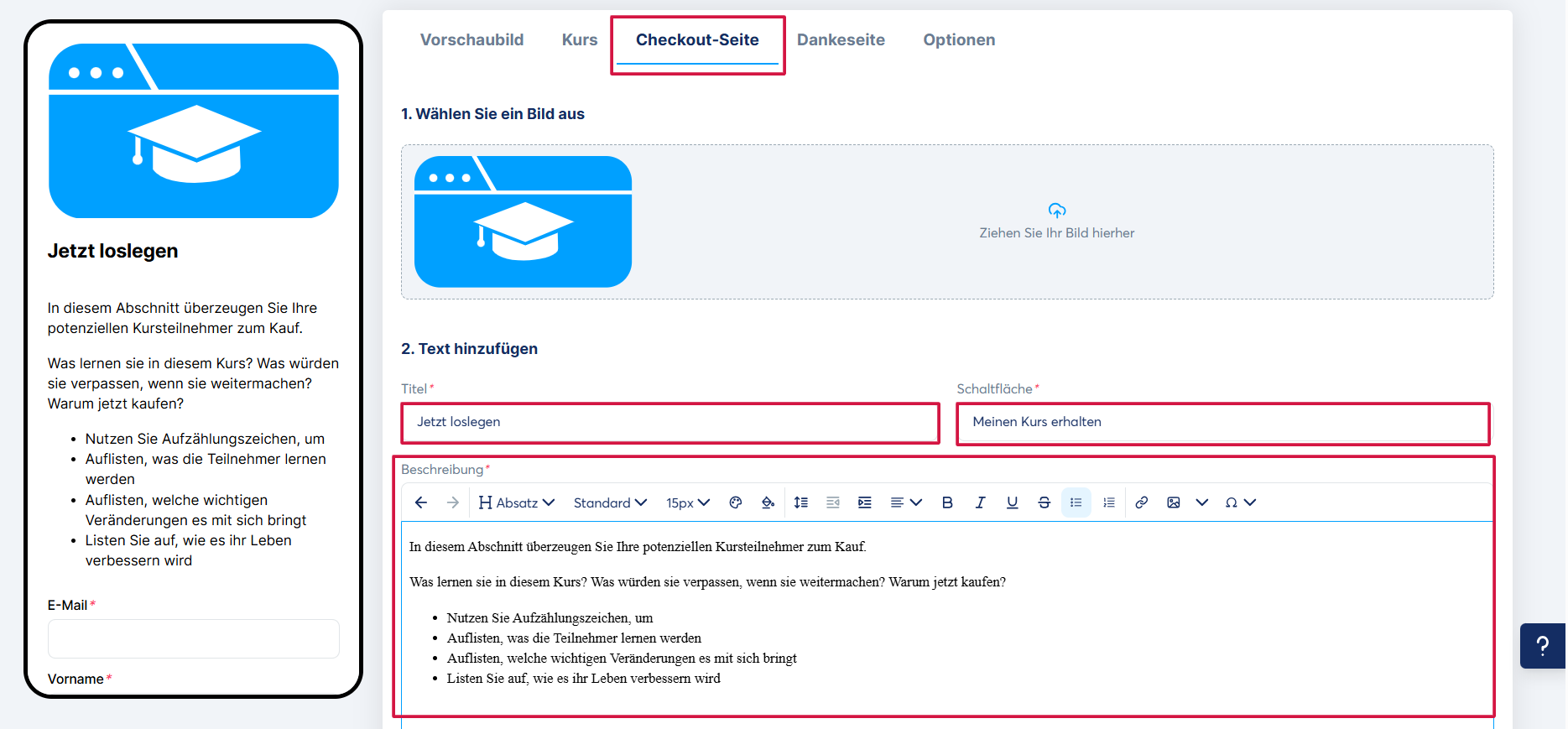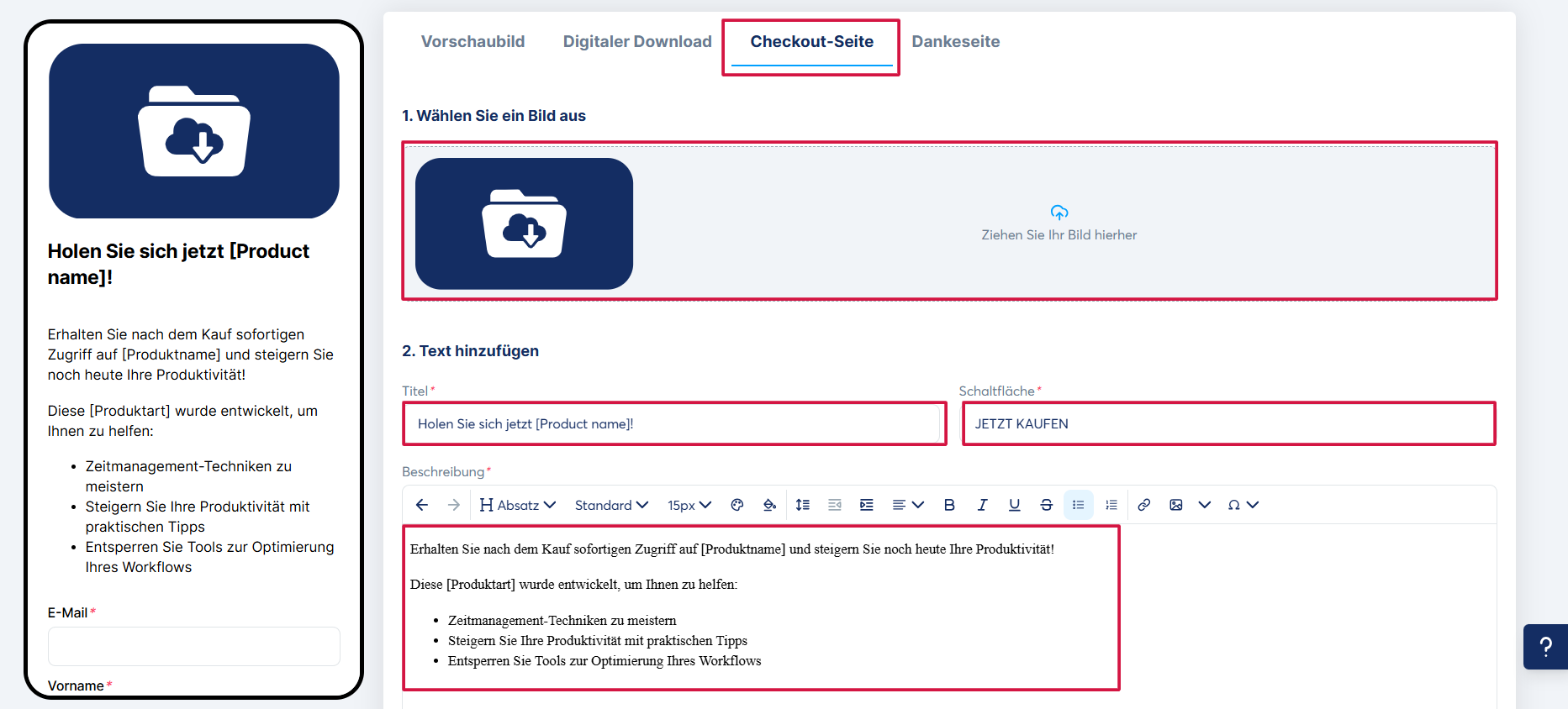 3. Checkout-Seite (Zahlungsseite): Fügen Sie ein Bild für Ihr Produkt hinzu sowie einen Text, der den Titel, einen Button und eine Beschreibung enthält.
