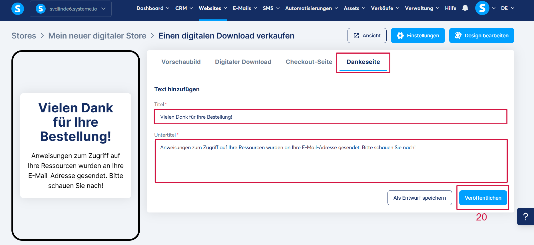 Klicken Sie abschließend auf „Veröffentlichen“ (20), damit Ihr Verkaufsprodukt in Ihrem Shop sichtbar wird.