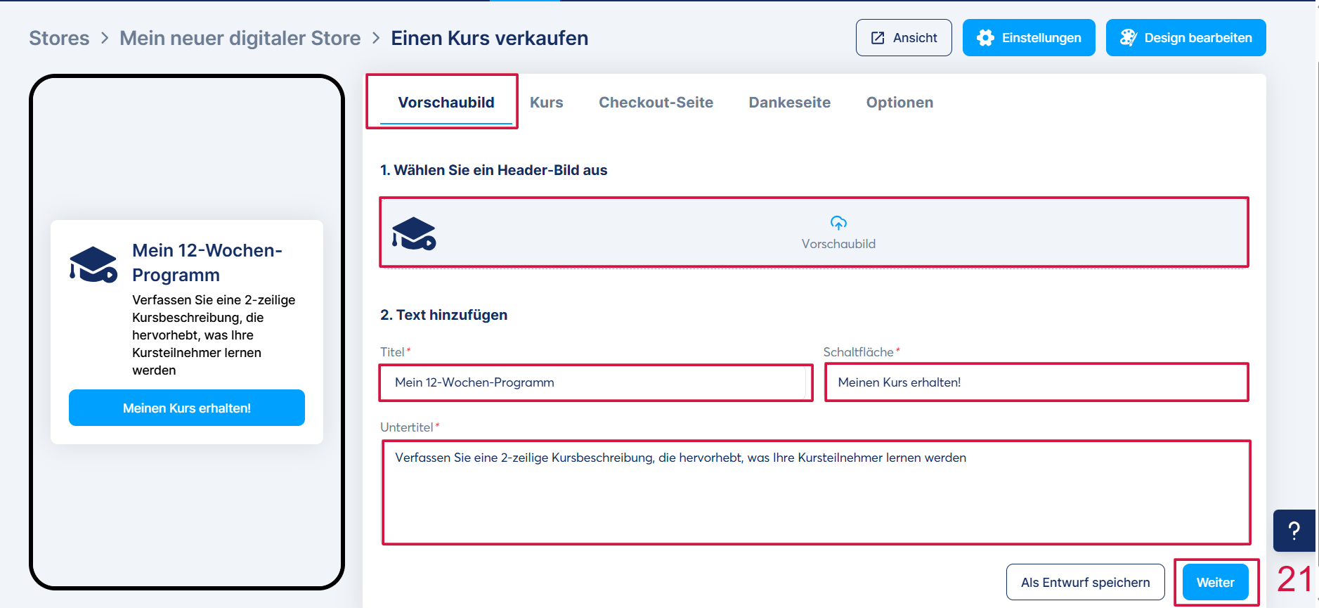 Klicken Sie anschließend auf „Weiter“ (21), um Ihre Änderungen zu speichern und zum zweiten Tab zu gelangen.