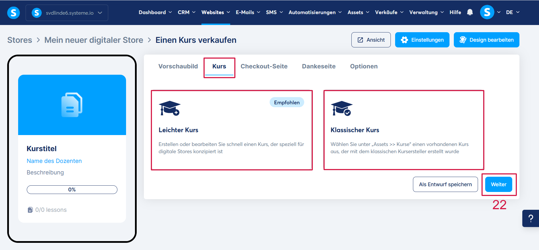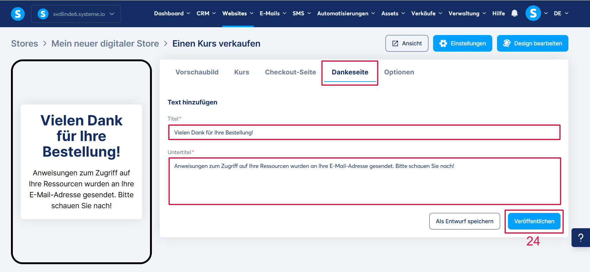 Klicken Sie anschließend auf „Veröffentlichen“ (25), um Ihre Änderungen zu speichern und den Kurs in Ihrem Shop verfügbar zu machen.