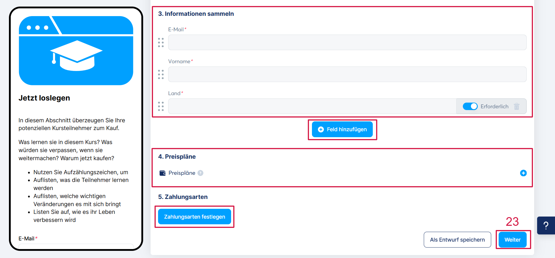 Klicken Sie abschließend auf „Weiter“ (23), um zu speichern und zum dritten Tab zu gelangen.