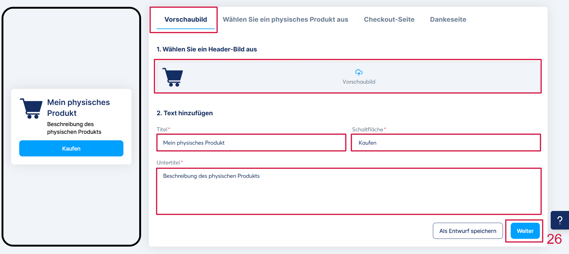 Klicken Sie anschließend auf „Weiter“ (26), um Ihre Änderungen zu speichern und zum zweiten Tab zu gelangen.