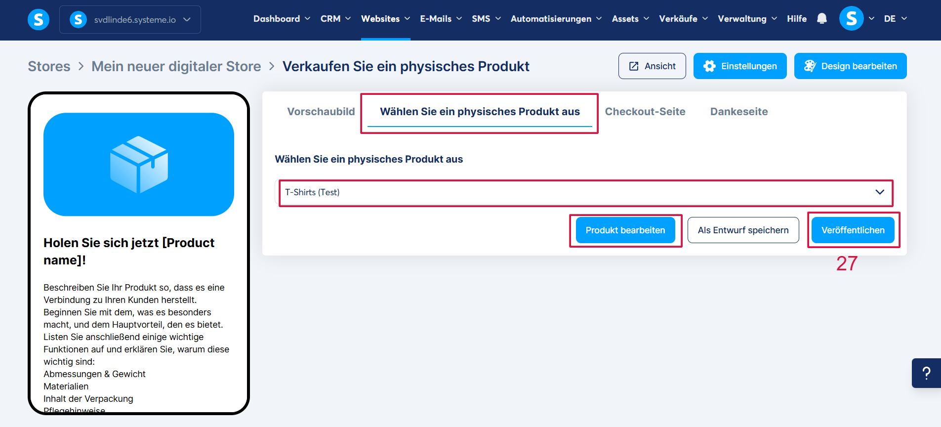 2. Physisches Produkt auswählen: Wählen Sie ein physisches Produkt aus, das bereits in Ihrem systeme.io-Konto erstellt wurde. Sobald es ausgewählt ist, können Sie es bearbeiten, indem Sie auf „Produkt bearbeiten“ klicken.