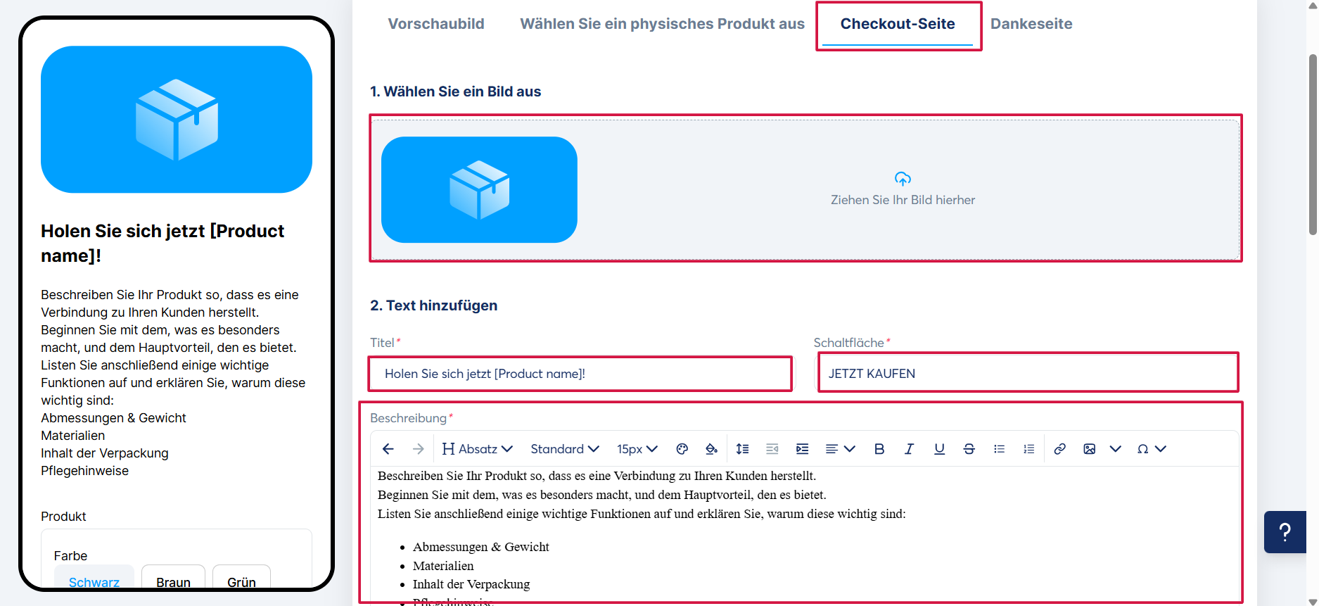3. Checkout-Seite (Zahlungsseite): Fügen Sie ein Bild für Ihr Produkt hinzu sowie einen Text, der den Titel, den Button und die Beschreibung enthält.