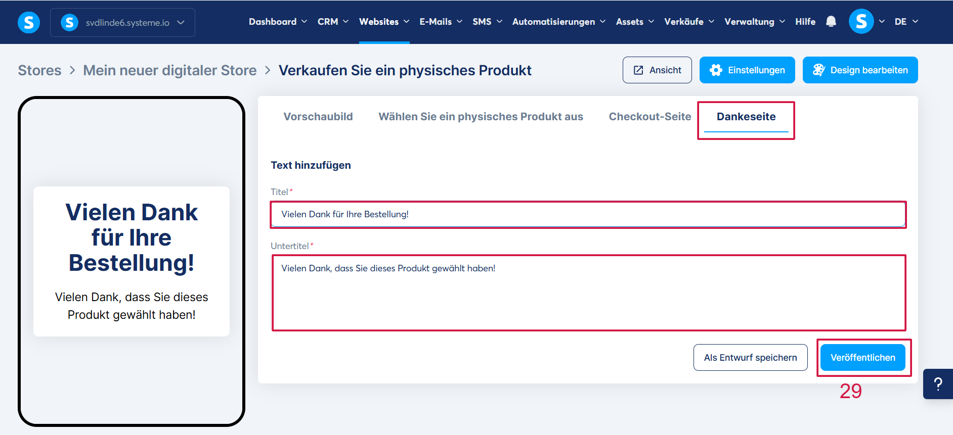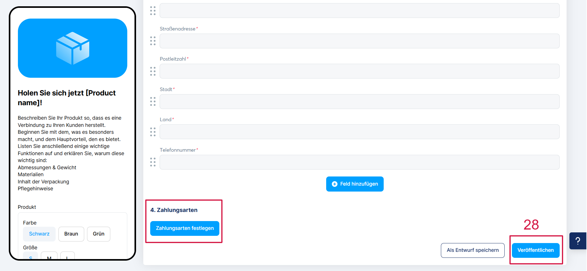 Klicken Sie abschließend auf „Veröffentlichen“ (29), damit Ihr Produkt in Ihrem Shop sichtbar wird.