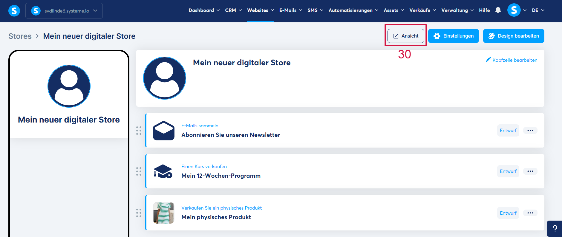 Um die endgültige Darstellung Ihres Stores zu sehen, klicken Sie auf „Ansicht“ (30).