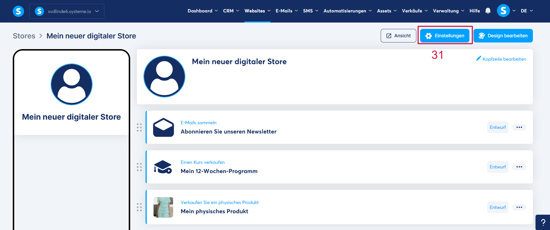 Sobald Sie Ihre digitalen Produkte veröffentlicht haben, können Sie die verschiedenen Einstellungen Ihres digitalen Shops konfigurieren. Klicken Sie dazu auf „Einstellungen“ (31).