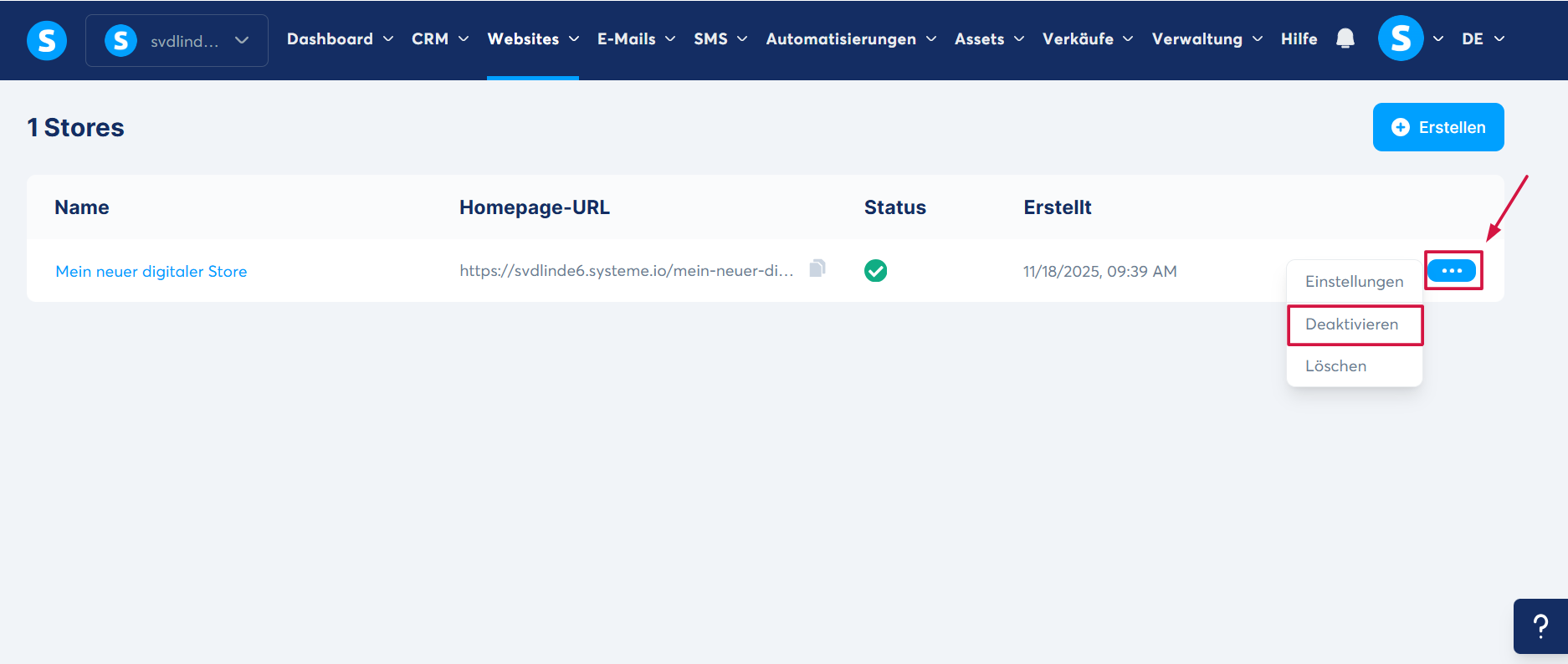 - Es ist möglich, einen digitalen Shop zu deaktivieren. Klicken Sie auf den entsprechenden digitalen Shop, dann auf das 3-Punkte-Menü und wählen Sie „Deaktivieren“.
