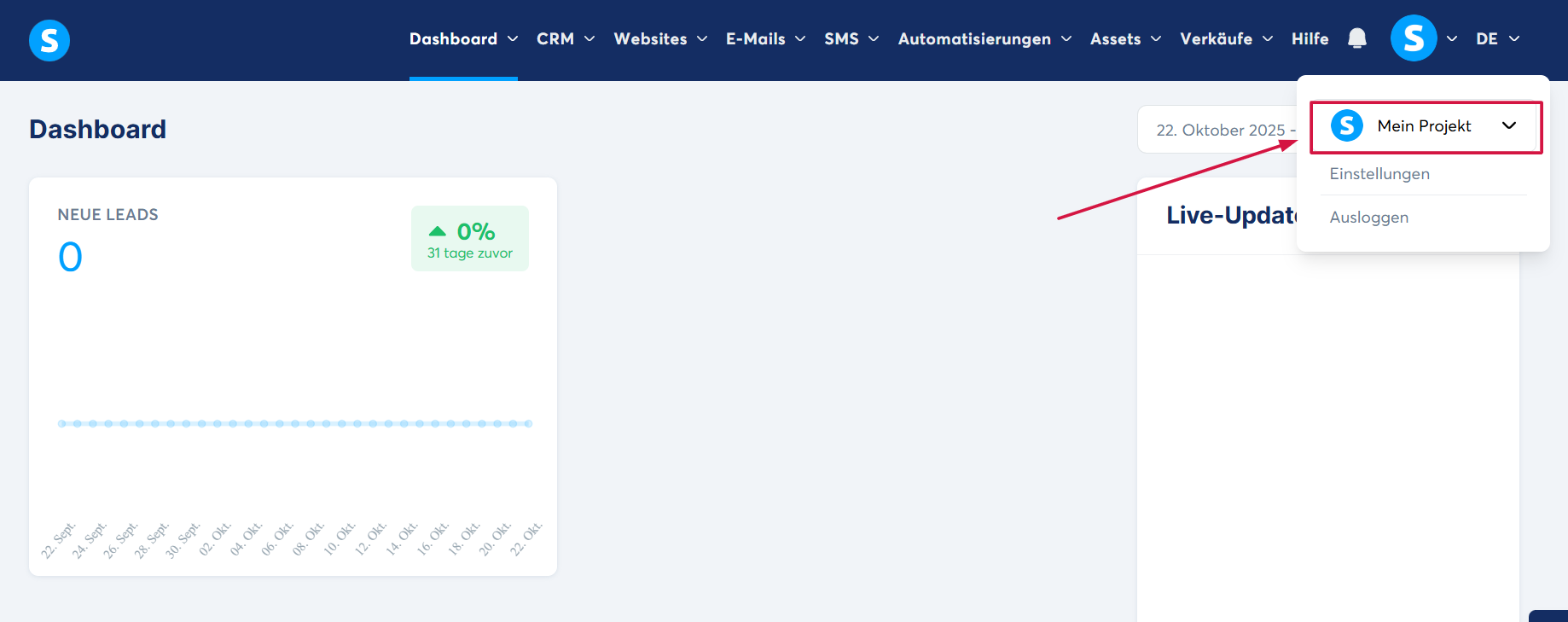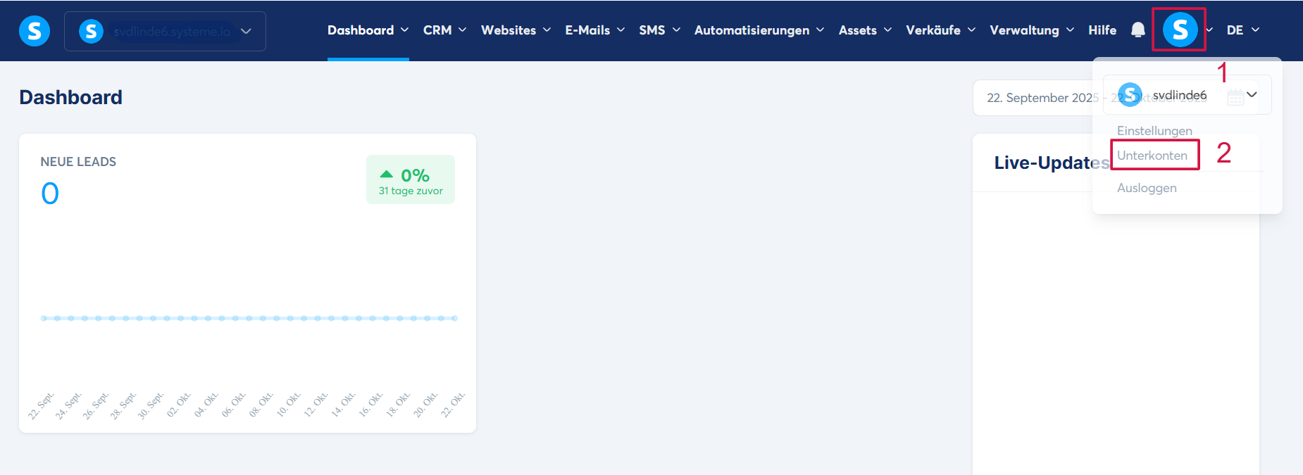 1. Klicken Sie im Dashboard oben rechts auf Ihr Profilbild (1) und wählen Sie anschließend „Unterkonten“ aus (2).
