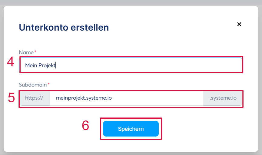 - Subdomain: Passen Sie das Unterkonto an, indem Sie eine Subdomain vergeben, über die Sie auf das Konto zugreifen können (Beispiel: meinprojekt.systeme.io) (5).