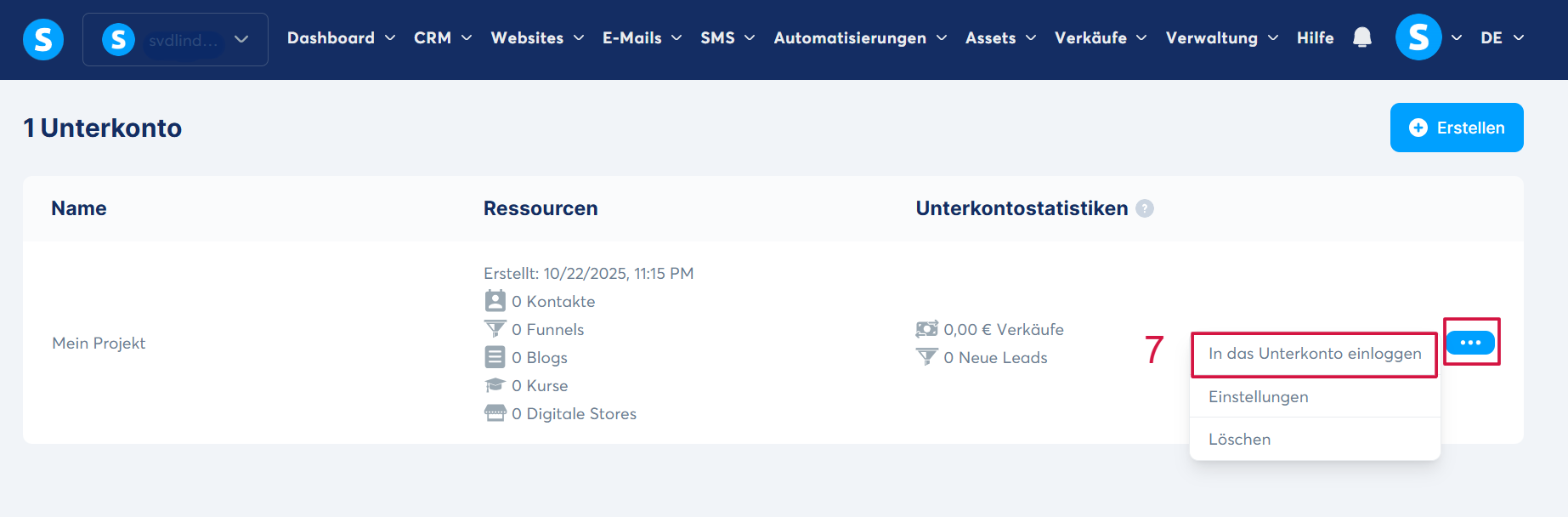 - Klicken Sie in der Zeile des erstellten Unterkontos rechts auf die drei kleinen Punkte und wählen Sie „In das Unterkonto einloggen“, um es zu verwenden (7).