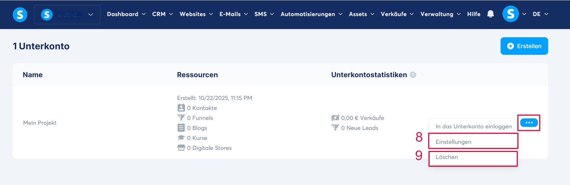 - Sie können den Namen des Unterkontos ändern, indem Sie auf den Bereich „Einstellungen“ klicken (8), oder Ihr Unterkonto löschen, indem Sie auf „Löschen“ klicken (9).