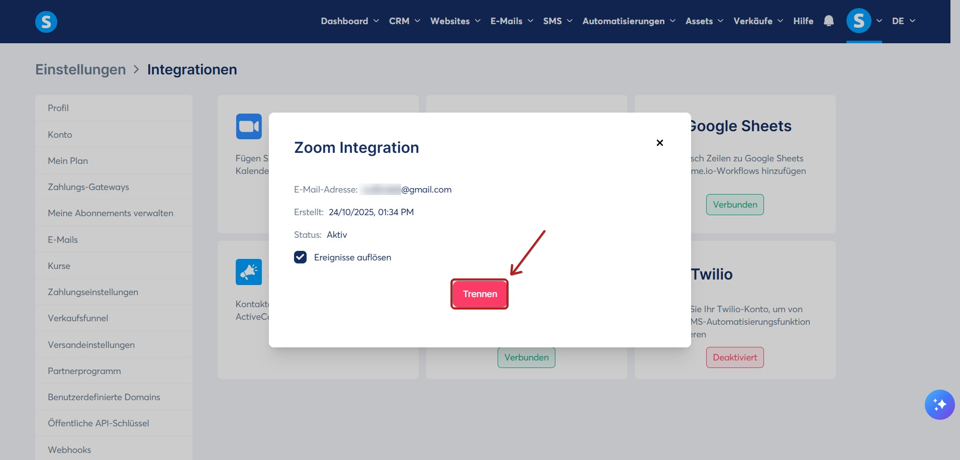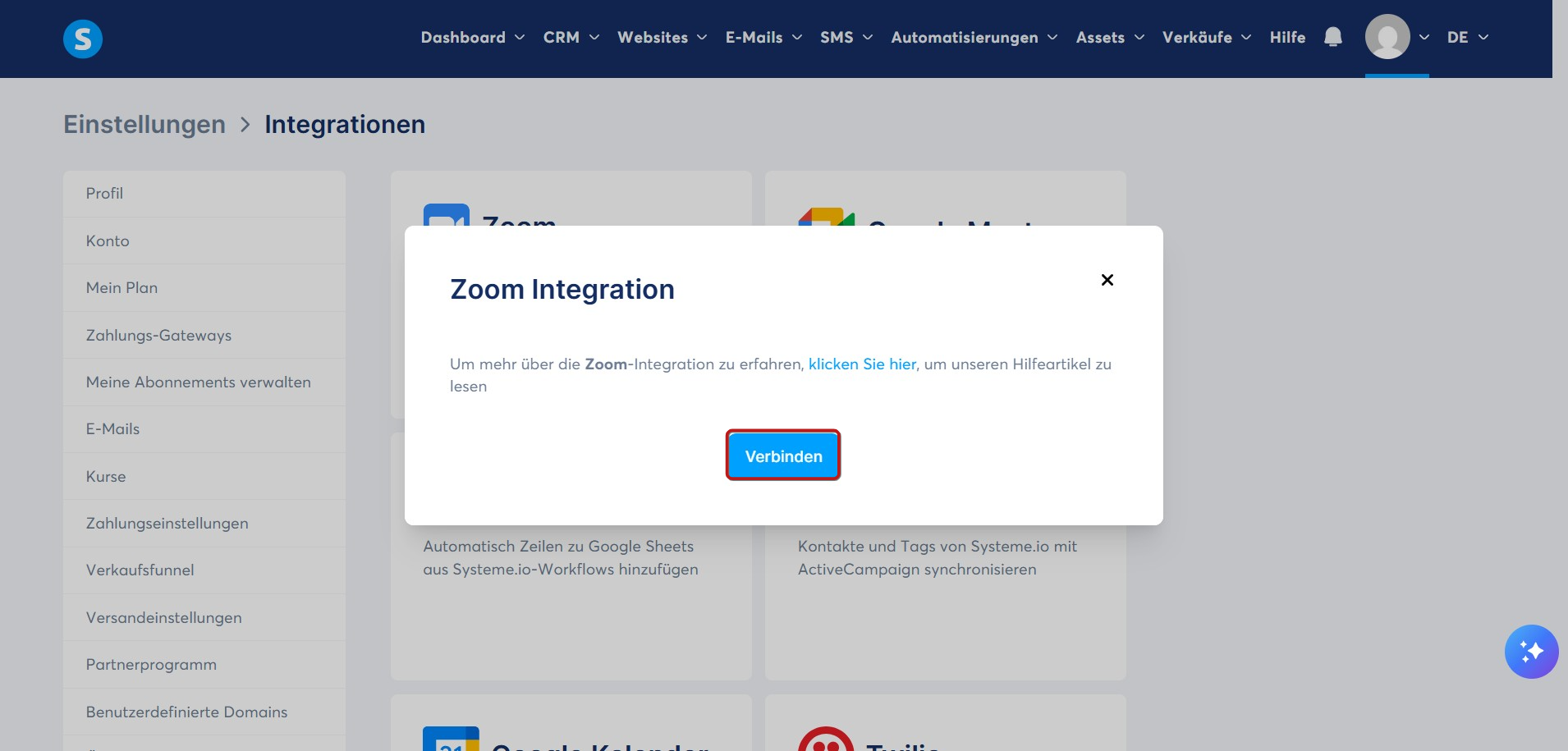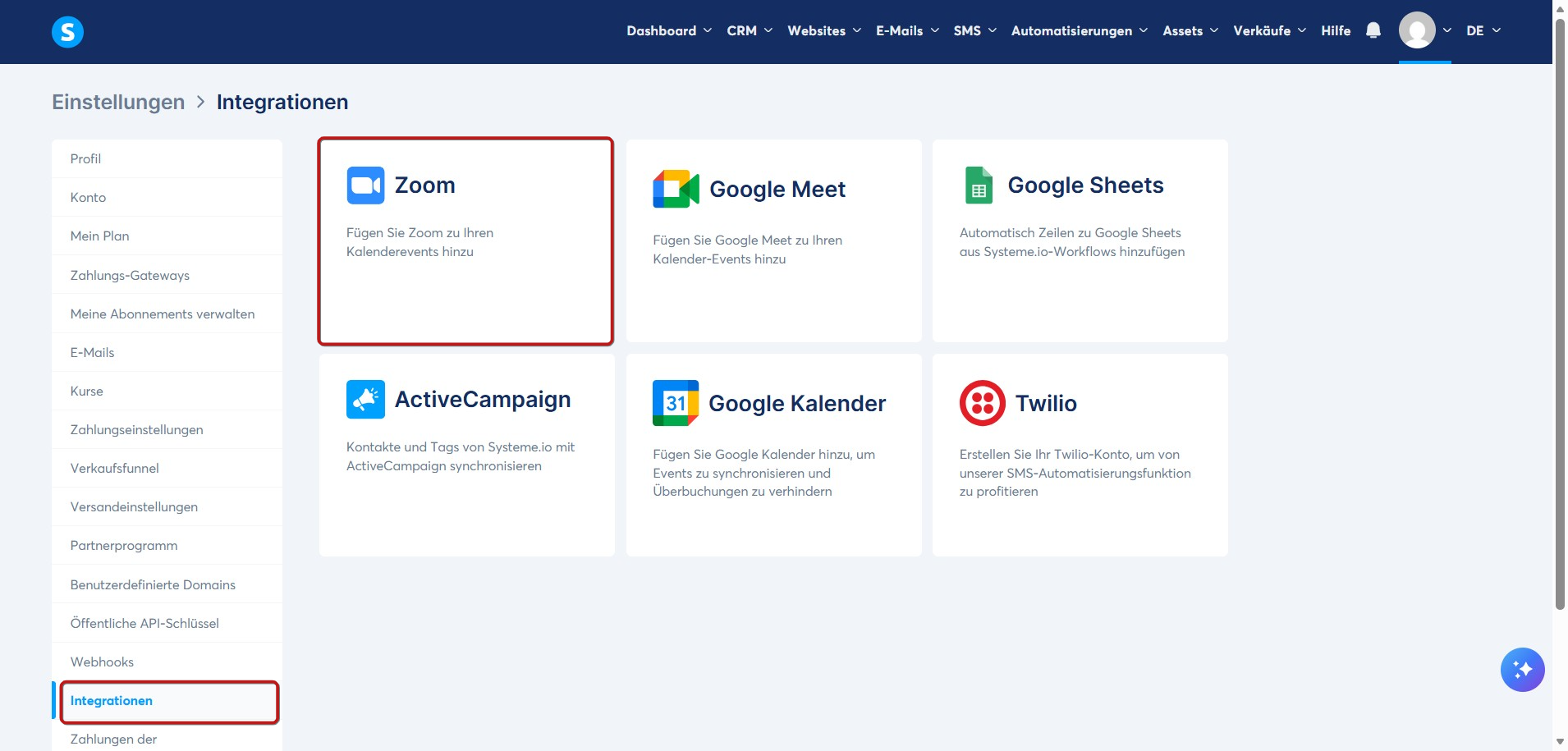 - Scrollen Sie im linken Menü nach unten zum Abschnitt Integrationen und klicken Sie darauf. Klicken Sie auf Zoom, um Ihr Zoom-Konto mit systeme.io zu verbinden.
