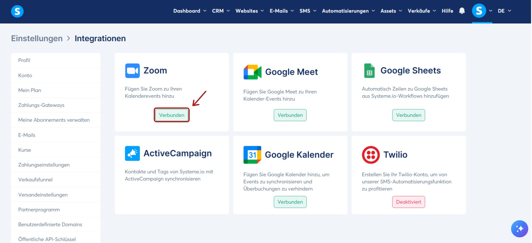1. Verbinden Sie Ihr Zoom-Konto mit systeme.io: