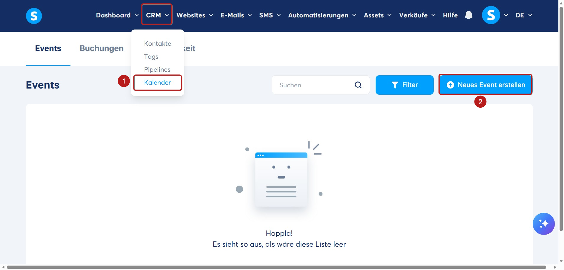 Gehen Sie zum Abschnitt CRM und öffnen Sie den Tab Kalender (1). Klicken Sie auf Neues Event erstellen (2), um mit der Einrichtung Ihres Ereignisses zu beginnen.