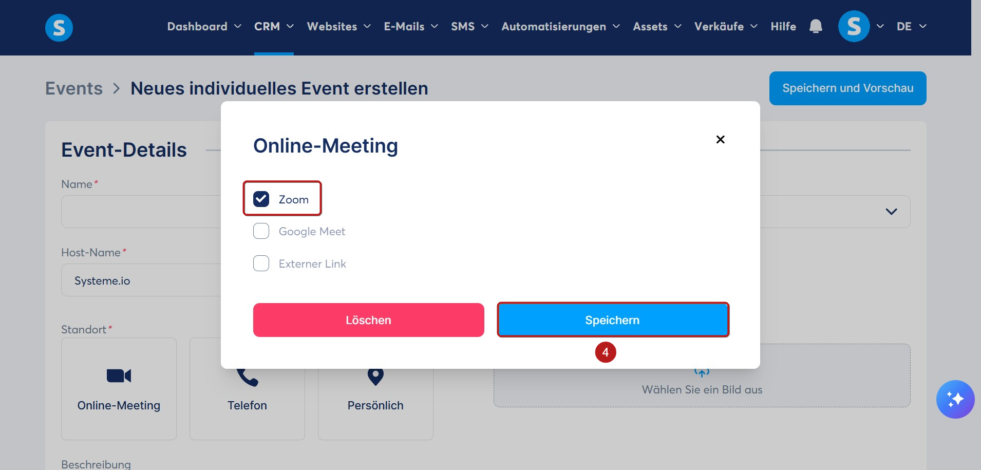 Es erscheint ein Popup-Fenster. Wählen Sie Zoom aus den verfügbaren Optionen und klicken Sie anschließend auf Speichern (4).