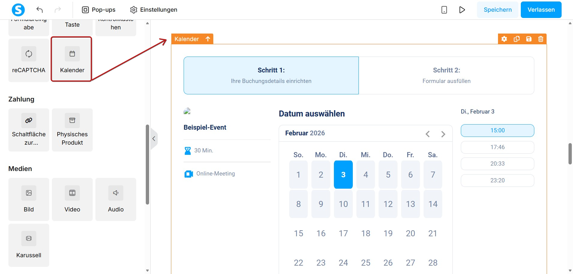 Sobald Ihr Event eingerichtet ist, öffnen Sie den Editor der entsprechenden Seite und fügen Sie das Kalender-Element hinzu.