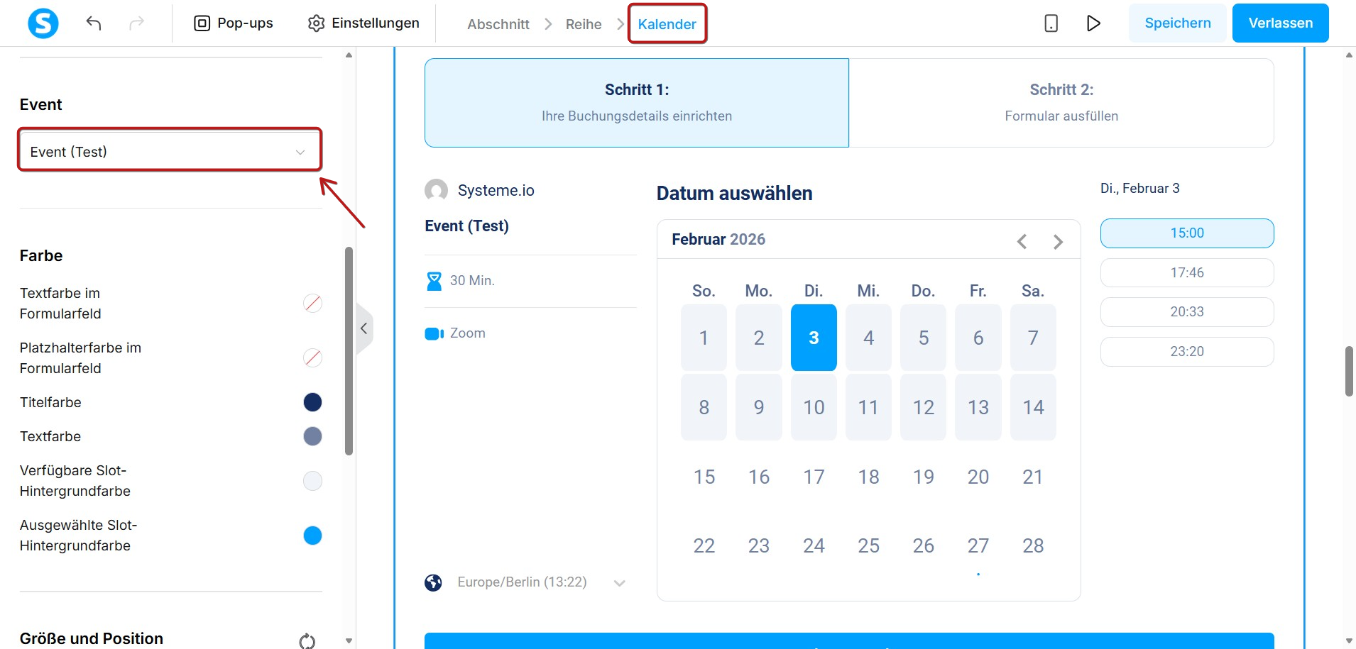 Wählen Sie das von Ihnen erstellte Event aus der Liste aus. Ihr Buchungskalender ist nun live und funktionsfähig.