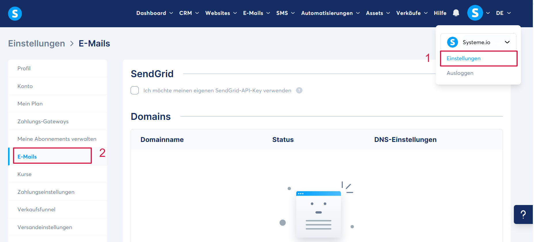 Gehen Sie in Ihr Menü, indem Sie auf Ihr Profilbild klicken, dann auf „Einstellungen“ (1) und wählen Sie „E-Mails“ aus (2).