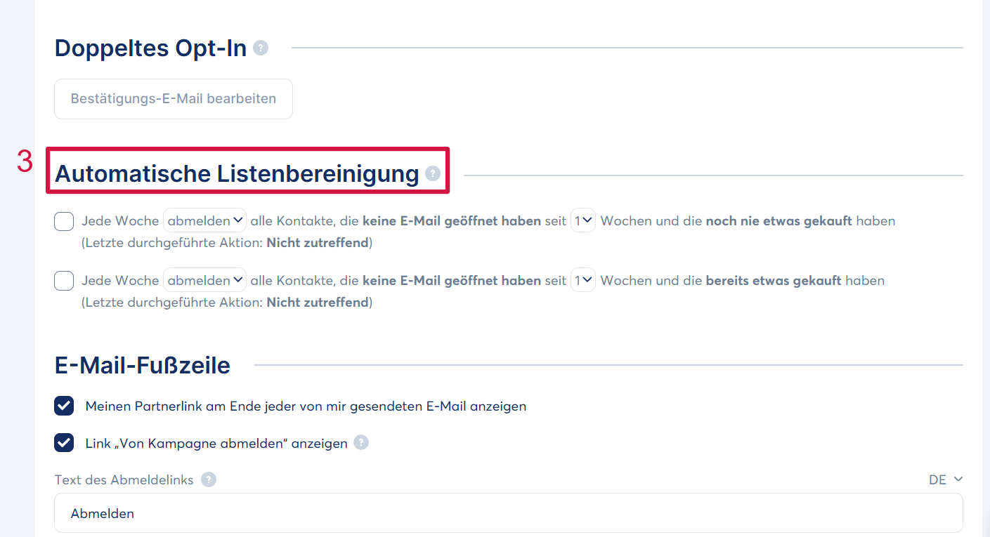 Gehen Sie zum Abschnitt „Automatische Listenbereinigung“, der weiter unten in den E-Mail-Einstellungen zu finden ist (3). Dort finden Sie die folgenden zwei Optionen: