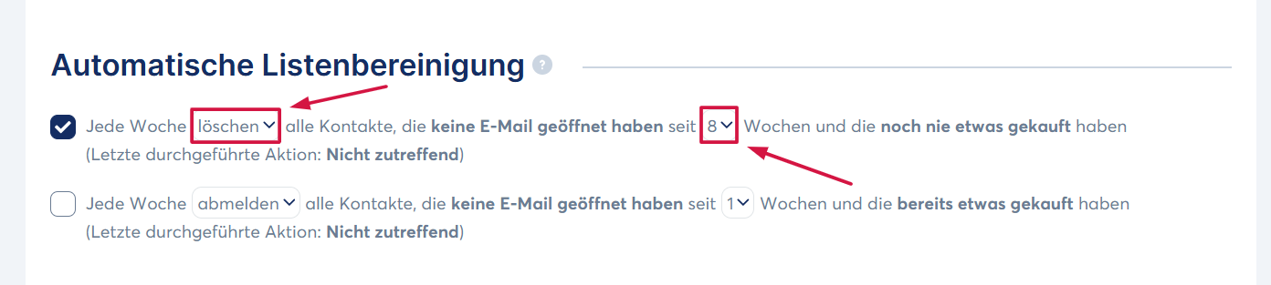 Sie müssen das erste Kästchen aktivieren: „Jede Woche ‚Löschen‘ aller Kontakte, die in den letzten ‚8‘ Wochen keine E-Mail geöffnet haben und noch nie etwas gekauft haben“.