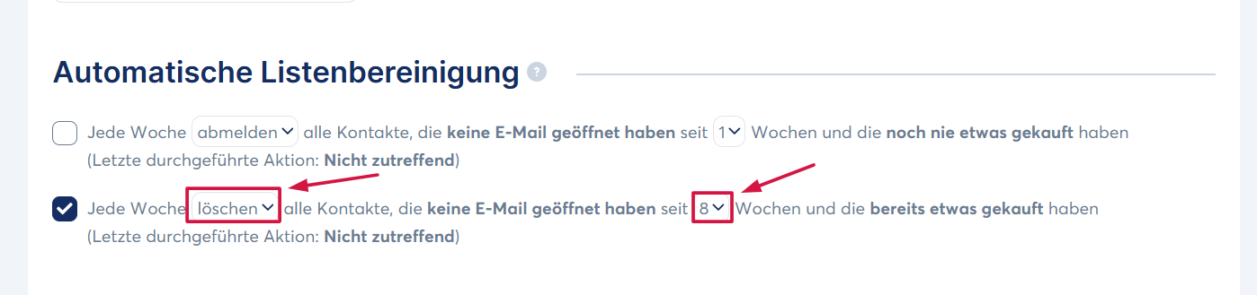 Sie müssen das zweite Kästchen aktivieren: „Jede Woche ‚Löschen‘ aller Kontakte, die in den letzten ‚8‘ Wochen keine E-Mail geöffnet haben und bereits etwas gekauft haben“.
