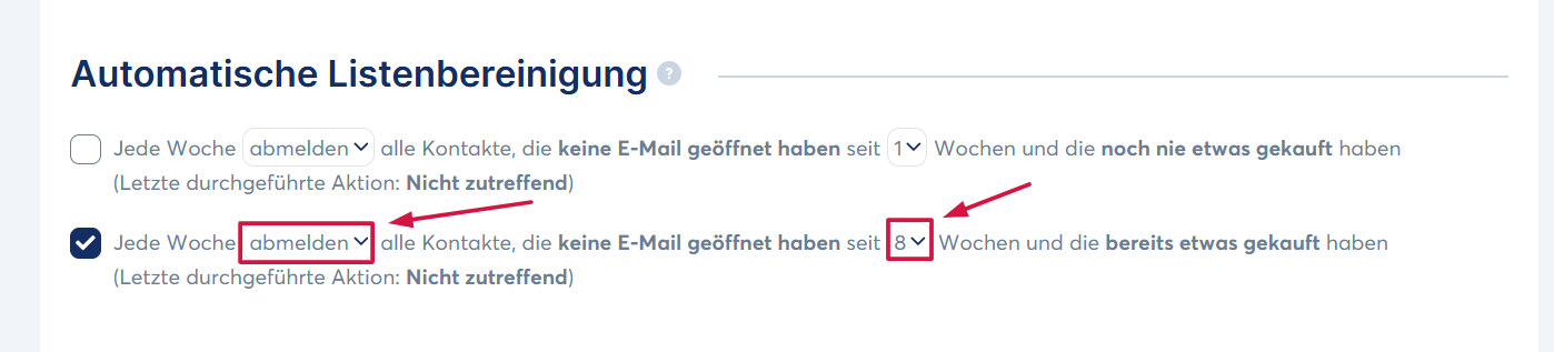 Bitte aktivieren Sie das zweite Kontrollkästchen „Jede Woche alle Kontakte ‚abmelden‘, die seit 8 Wochen keine E-Mail geöffnet und bereits etwas gekauft haben“.