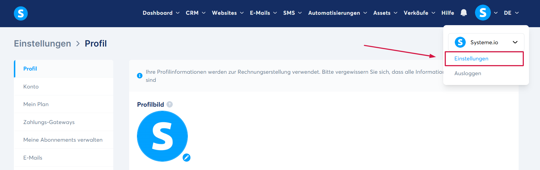 - Klicken Sie auf Ihr Profilbild und gehen Sie dann zum Bereich „Einstellungen“.