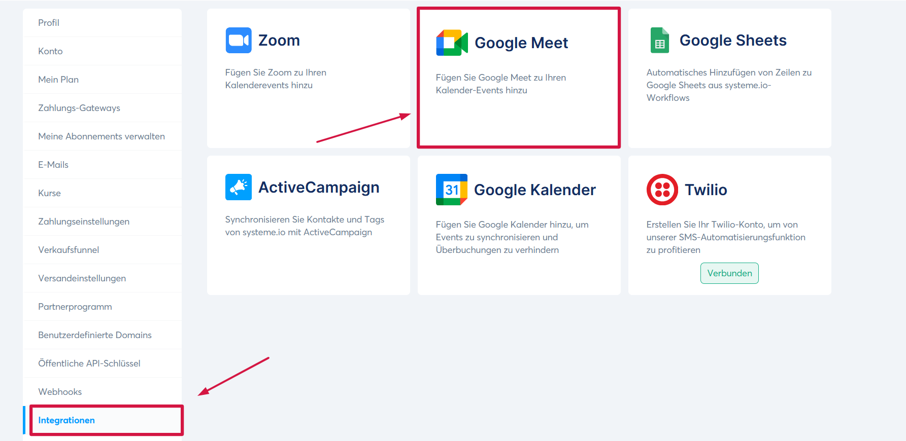 - Klicken Sie unter den verschiedenen verfügbaren Integrationen auf „Google Meet“, um ein Google-Konto zu Ihrem systeme.io-Konto hinzuzufügen.