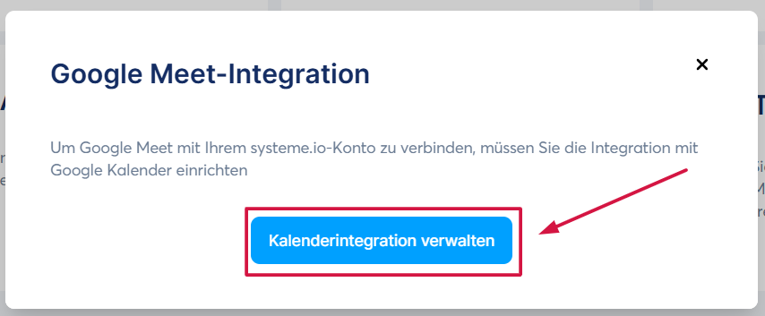 - Ein erstes Pop-up-Fenster erscheint mit dem Hinweis, dass Sie zuerst Google Kalender integrieren müssen. Klicken Sie dazu auf „Kalenderintegration verwalten“.