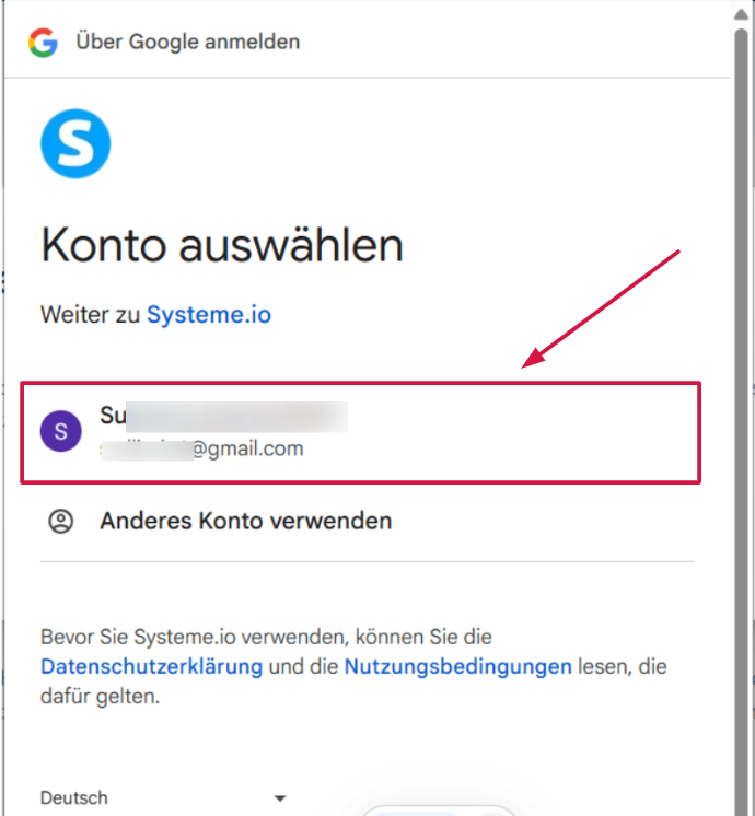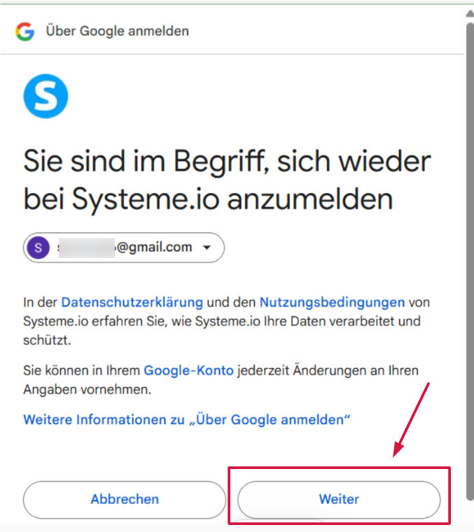 - Klicken Sie auf „Weiter“, damit Google systeme.io den Zugriff auf Ihre Informationen erlaubt.