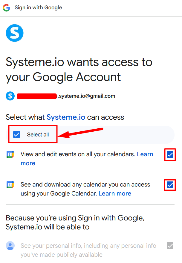 - Es öffnet sich ein Fenster mit einer Zugriffsanfrage von systeme.io auf Ihren Google Kalender. Aktivieren Sie einfach das Kontrollkästchen „Alle auswählen“, wenn die Autorisierungsanfrage erscheint. Dadurch wird der Zugriff zum Anzeigen, Bearbeiten und Überprüfen all Ihrer Kalender freigeschaltet. So kann systeme.io Ihre Termine automatisch synchronisieren, insbesondere für Terminvereinbarungen oder kalenderbezogene Automatisierungen.