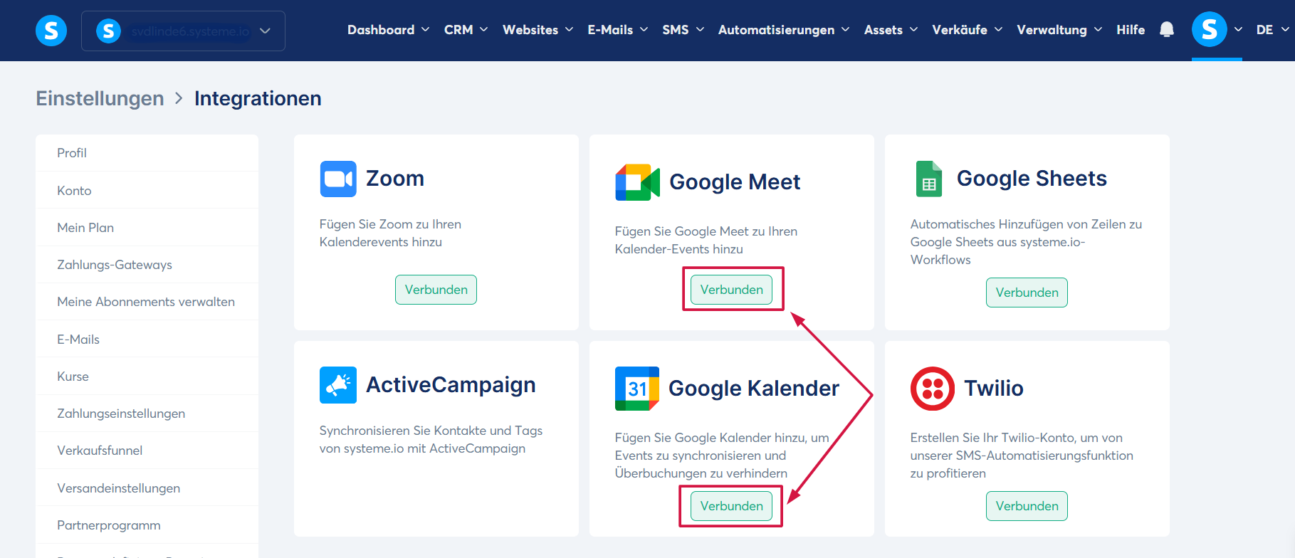- Abschließend sehen Sie, dass die Integrationen von Google Kalender und Google Meet nun mit Ihrem systeme.io-Konto verbunden sind.