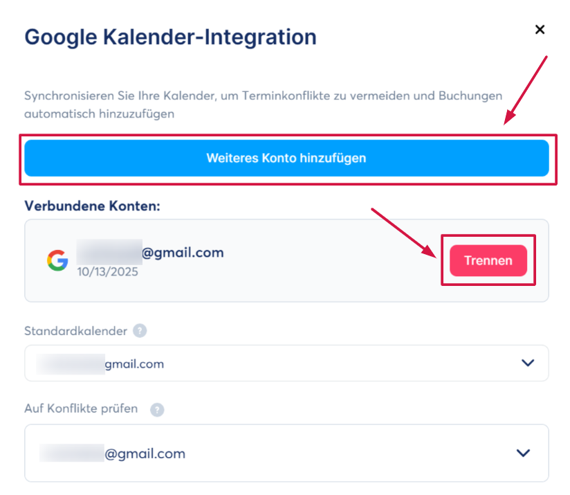 - Sie können mehrere Google-Meet-Konten in Ihr systeme.io-Konto integrieren; dafür müssen Sie einfach mehrere Google-Kalenderkonten verbinden.